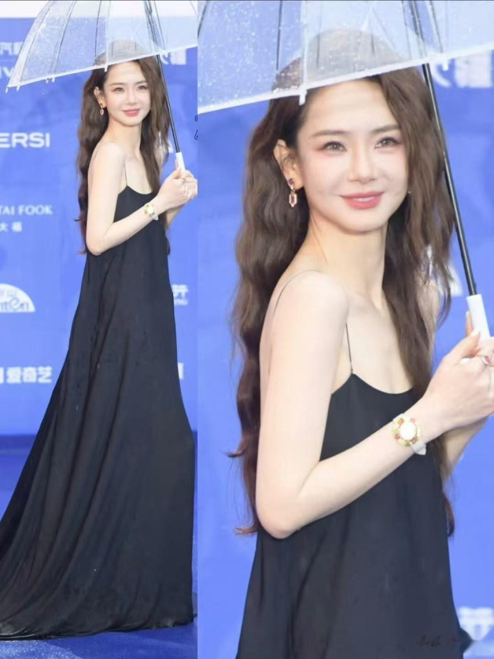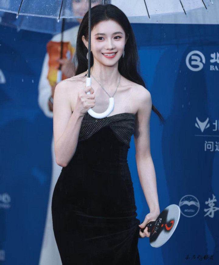 当天她一袭黑色抹胸丝绒长裙亮相,裙身点缀的亮钻在雨水中折射出细碎微光,宛如从童话中走出的黑天鹅,简约却不失精致。